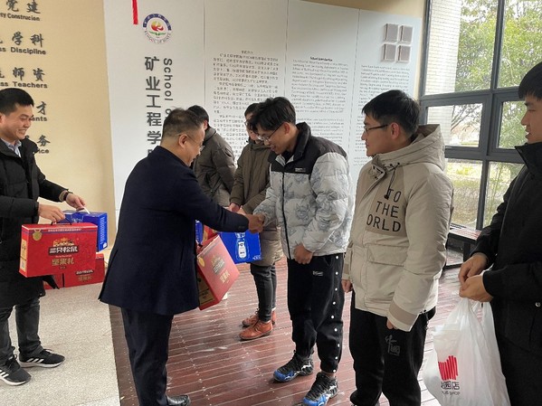 慰问过程中,张吉雄经理与留校员工亲切交谈,逐一询问了员工们的日常学习生活情况,并强调同学们留校期间一定要遵守规章制度,注意人身安全,做好疫情防控。张经理表示,矿业学院始终关心着每一位留校员工,希望同学们在学校合理安排好假期生活,注意安全,度过一个平安幸福的春节。随后,张吉雄经理代表学院向每一位假期留校员工发放了慰问礼包。