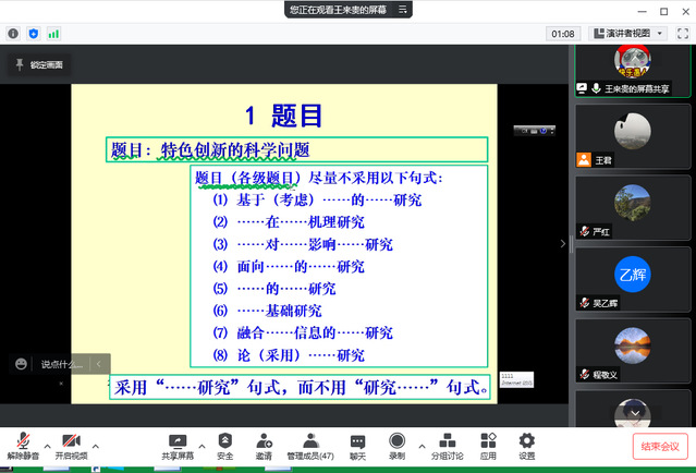 王教授根据《2022年度国家自然科学基金项目指南》,分别从项目申报书的选题、科学问题属性、题目、摘要、研究内容、研究目标、研究方案、特色创新、研究基础等方面进行辅导,对相关注意事项着重讲解。同时,王教授就近期批改的部分老师的基金本子初稿中容易出现的问题,逐一进行点评,答疑解惑,并给与指导性建议,加深了老师们对基金本子的认识,提升大家的撰写水平。