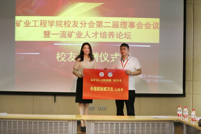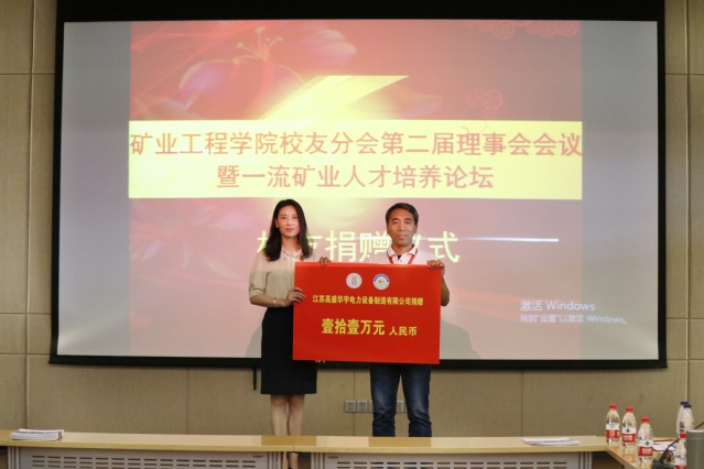 会上,举行了员工现场捐赠仪式,江苏高盛华宇电力设备有限公司董事长92级员工吕明俊、采矿93-2班员工代表上海大屯能源股份有限公司副总经理孙凯上台进行捐赠,行政副经理王晓琳代表学院接受了捐赠。