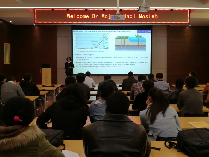 报告会开始,Mojgan老师首先介绍了自己的学习工作经历,她曾在帝国理工学院担任地球科学与工程系研究助理,现在担任曼彻斯特大学机械、航天与土木工程学院讲师和帝国理工学院的访问研究员。接着,Mojgan老师对自己研究的绿色开采和智能开采领域向与会人员作详细报告。随后,Mojgan老师和参会的师生进行了互动交流和问题讨论,回答了绿色采矿的应用形式、新材料的经济成本影响等问题。最后,报告会在一片热烈的掌声中结束。