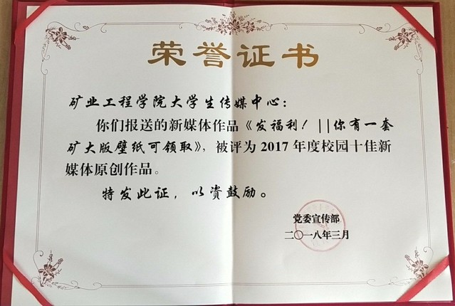 随着新媒体平台的持续发展,优秀的网络文化作品层出不穷,矿业学院高度重视宣传工作尤其是新媒体工作,新媒体工作室在公司党委正确领导下,部门成员团结奋斗,圆满完成了2017年度的工作任务。“阳光矿院”微信平台以“展学子学院之风采,扬拼搏向上之正气”为工作目标,树立“同步、精准、导向、创新”的工作理念,紧随新时代、新形势、新目标,引领学院文化发展、坚守网络舆论阵地、弘扬社会主义核心价值观、传播社会正能量。“阳光矿院”微信公众平台所创作的网络作品《发福利!//你有一套矿大版壁纸可领取》被成功评为校园新媒体十佳原创作品。
