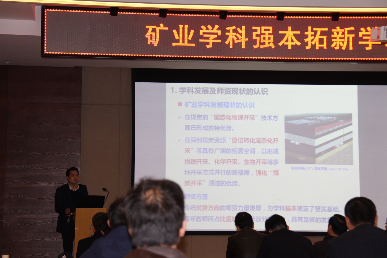 下午第一阶段会议有5位教师汇报。曹安业教授在强本基础上,提出拟在海底强流态状态下或太空微重力状态下采矿岩层破断的地球物理监测方法方面开展探索的设想;李小林副教授介绍了工业工程学科的概念、学科层次、相关学校以及学科现状,提出了融入采矿,开展矿业资源生产管理系统优化、矿业大数据分析与挖掘、基于虚拟仿真的矿山智能化开采系统建设等新方向研究的设想;王方田副教授以海域天然气水合物开采方法与灾害防控为题介绍了个人在拓新方面取得的初步成果,并就下一步研究重点和目标进行了展望;张源副教授对一流团队建设方向进行了分类,提出了主攻目标,建议以研究所形式组建团队,介绍了地热开发的拓新内容与目标;周楠副教授提出了对地下城市工程新工科专业建设方面的疑问,提出了矿井隔热充填材料研发与矿井降温的拓新方向。