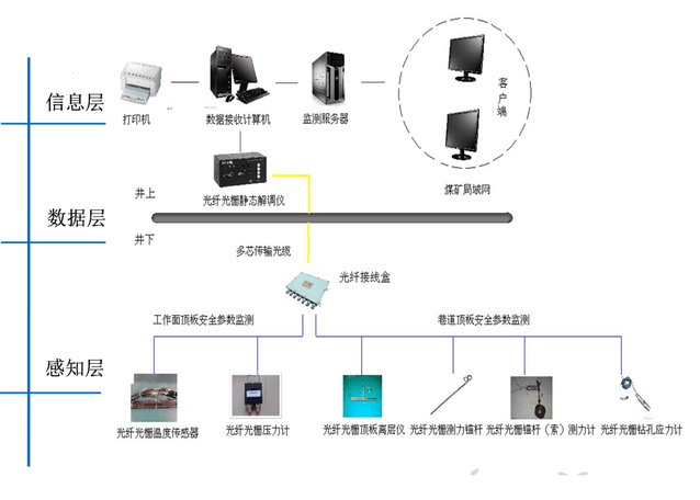 该系统针对我国煤矿安全监测手段落后现状,采用了光纤传感技术,具有本质安全、抗电磁干扰、防水性能强、传输距离远、灵敏度高、便于组网、感知和传输一体化、可实现分布式测量等优点;通过光纤光栅解调仪器将光信号解调为数字信号上传至监控主机,引入专家系统进行数据分析处理,实现对煤矿巷道矿压、工作面矿压、采空区温度、设备健康等内容的智能化监测,提高了煤矿安全管理水平和生产效率,为建设安全矿井和高效矿井、树立矿井良好的社会形象奠定了基础,有利于推动矿井智能化建设进程。