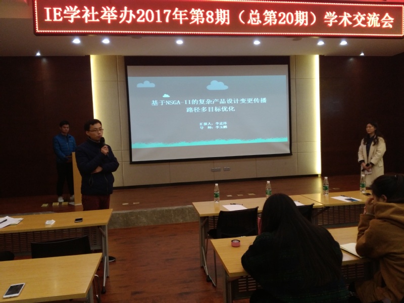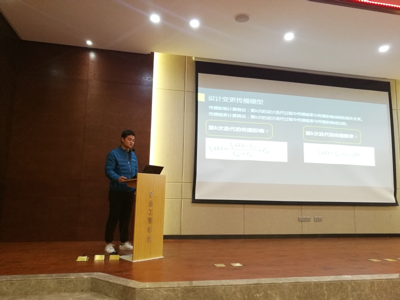 李孟泽同学的报告主题为“基于NSGA-II的复杂产品设计变更传播路径多目标优化”。为了在复杂产品开发过程中对产品设计变更的传播进行预测和控制,设计者需要从所有可能的传播路线中选择最佳的方案。针对过去产品设计变更传播模型的按顺序先后处理功能、结构、制造变更效率上的不足,提出了并行变更传播的设计思想,将产品设计过程中的变更进行并行处理,以时间作为判据来搜索最短的变更传播路线。
