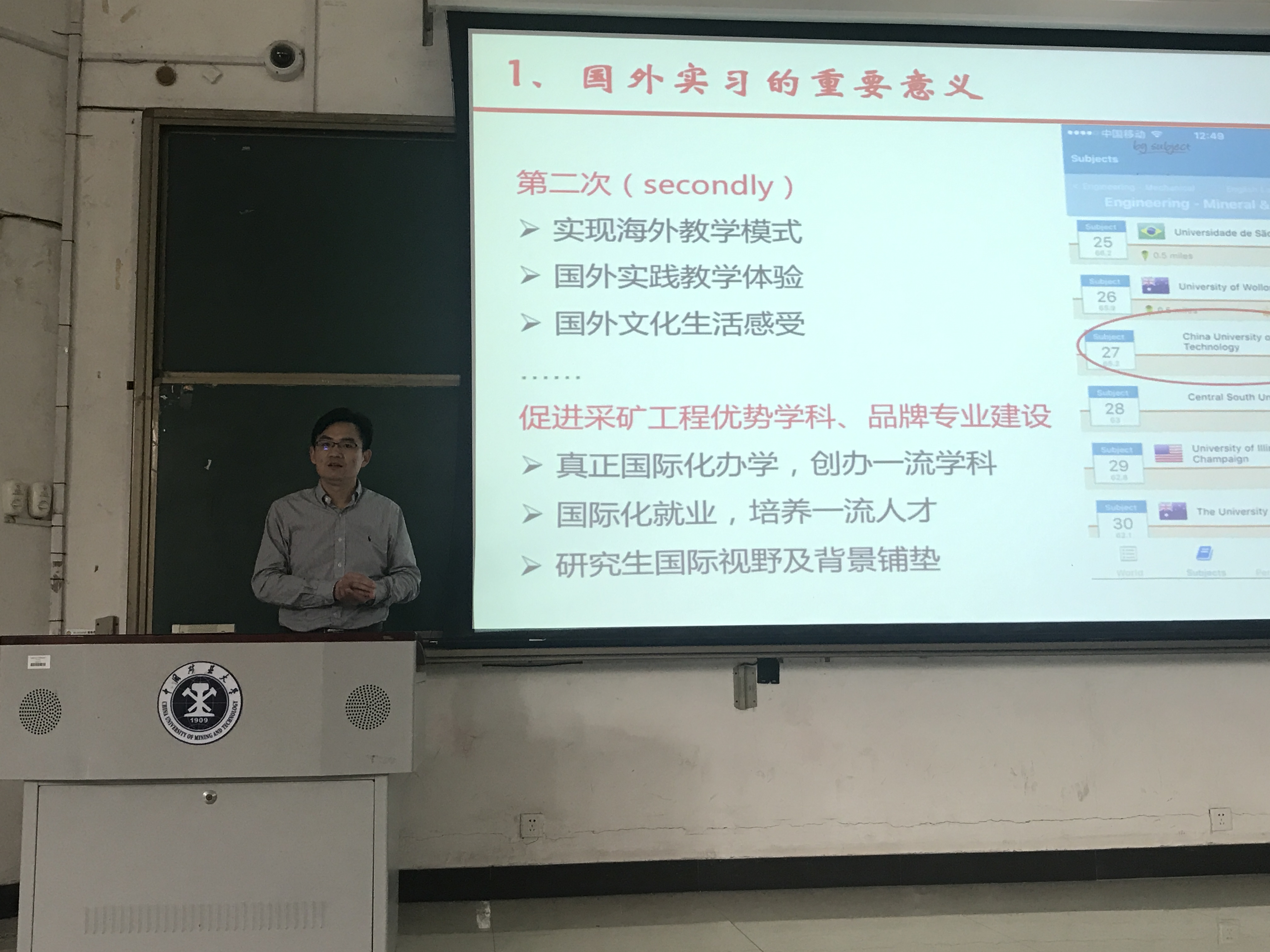 4月19日下午4:00,采矿工程专业国际实习动员会在博2C102召开,采矿工程14级参加生产实习的员工参加了此次动员会。采矿工程系副主任、专业建设负责人李桂臣教授、采矿工程系副主任徐营副教授、首次澳洲实习带队教师张磊副教授、本次澳洲实习带队指导教师范钢伟副教授参加报告会。报告会由李桂臣教授主持。