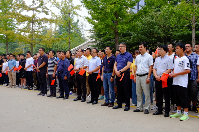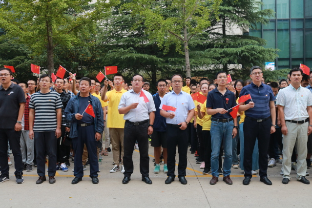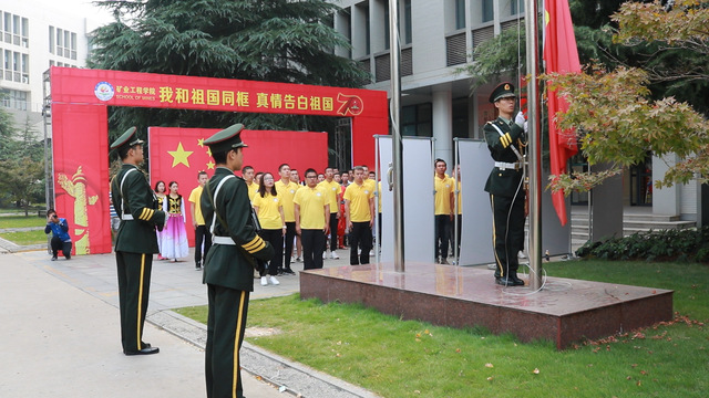 8时整,在矿业学院楼门前,学院参加活动的全体师生面向国旗、奏唱国歌,在雄壮的国歌声和师生的注目中,鲜红的国旗冉冉升起,迎风飘扬。