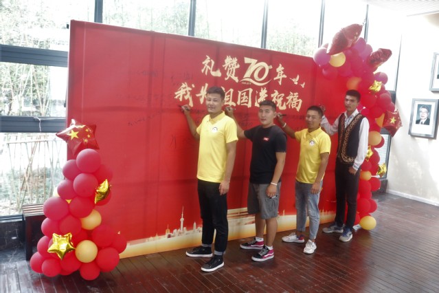 员工在“礼赞70年、我为祖国送祝福”的留言板下合影留念