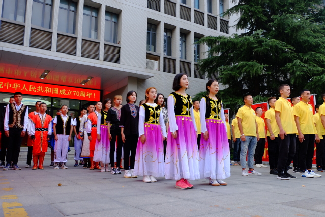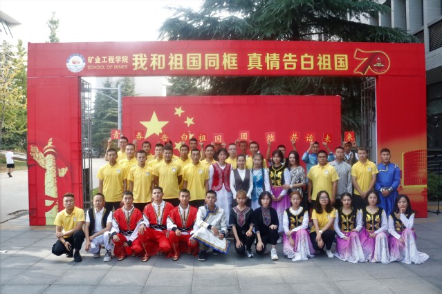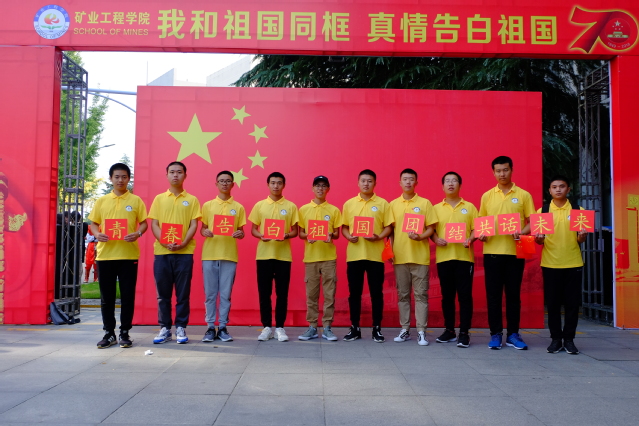 活动现场,学院少数民族员工代表组成“70”形状的方阵,高声合唱《我和我的祖国》。在场所有师生挥舞手中的小国旗,以饱满的热情唱响《今天是你的生日》,共祝伟大祖国70华诞。矿业类2019-5班贾浩男同学做了题为《青春告白祖国,勇担时代重任》的国旗下主旨演讲。