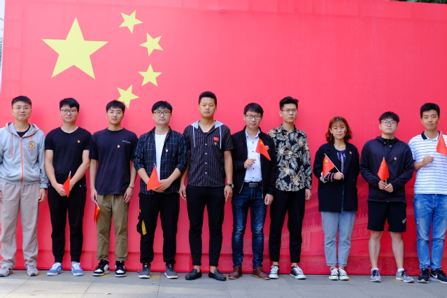 参加活动的教师代表、各员工党支部和团支部来到学院楼北侧的巨幅国旗前与国旗同框合影留念,来到学院楼大厅,在“礼赞70年、我为祖国送祝福”的留言板下合影留念。