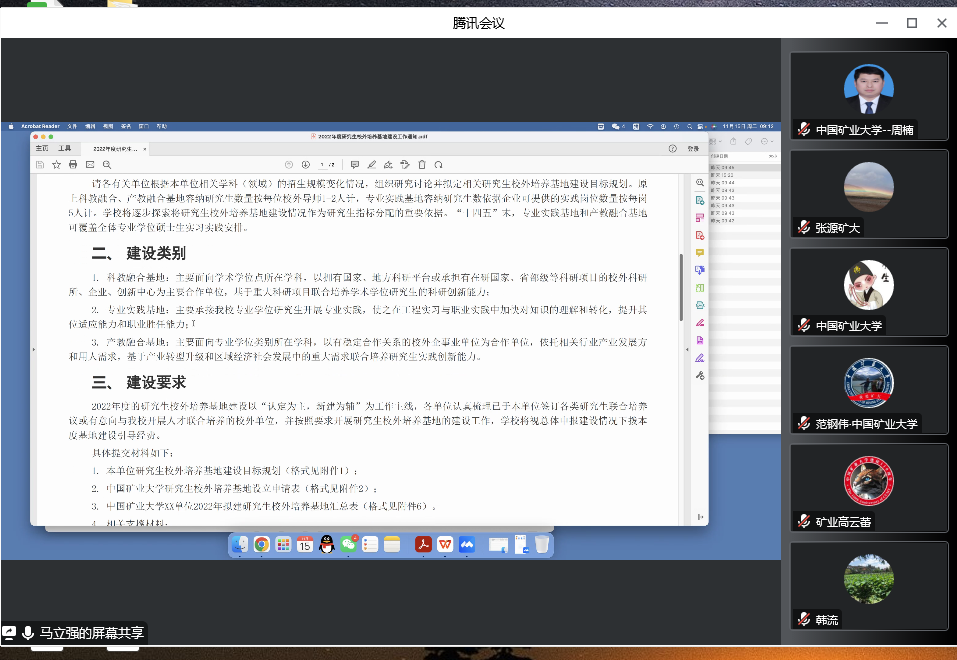 会上,马立强副经理首先向参会老师们解读了学校“2022年度研究生校外培养基地建设工作通知”,并解释了2022年度的研究生校外培养基地建设以“认定为主,新建为辅”的工作主线,希望大家一定要按照学校通知要求保质保量的完成任务。各系主任就通知的具体内容进行了询问和讨论,并就具体推进情况做了简要汇报。大家认识到研究生校外培养基地的建设,有助于提升研究生的实践水平和实践能力,有助于培养研究生的综合能力和日后解决工作的实际能力,并能以此为抓手逐步完善研究生的教育体系,夯实研究生教学基础,进一步促进矿业工程一流学科人才的培养。