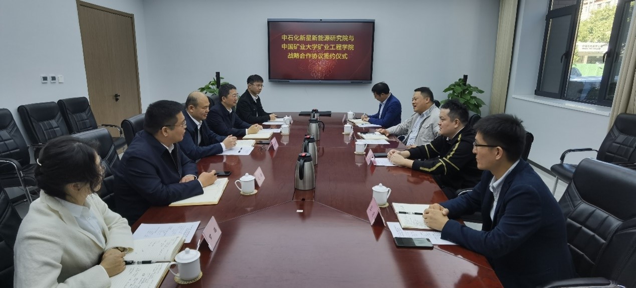 10月20日,公司党委书记闵涛一行赴中石化新星(北京)新能源研究院有限公司开展合作交流以及合作协议签约仪式。新能源科学与工程系主任马丹,系副主任严红、张源和中石化新星(北京)新能源研究院有限公司党委书记梁海军、经理杜利、副经理毛翔、综合管理部经理唐果、地热实验室主任罗璐等参加交流活动。