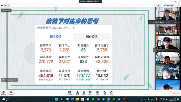 本次活动以线上会议的方式进行,主要包括三部分内容:会议开始,班级团支书陶旭凡同学强调了疫情中经常出现的各类问题并向大家提出了各种针对性的建议与应对措施,积极地与同学们进行互动。会议期间,各个班委也就学风,宿舍卫生等问题进行了汇报。会议最后,闫帅老师对本次活动进行了总结,要求同学们在日常生活和线上学习中遵守各项规定,并祝福每位同学身体健康,学习进步。