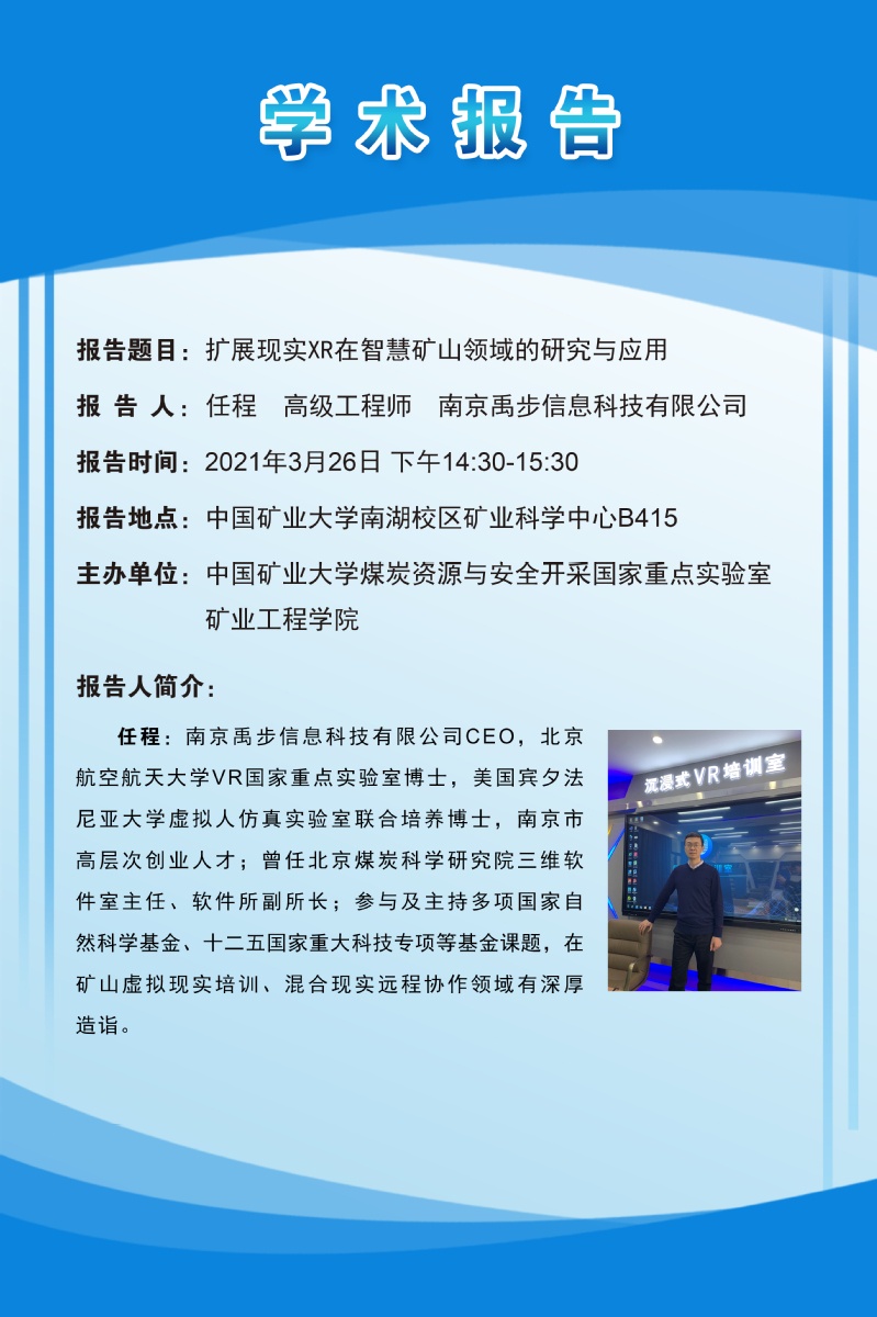 学术会议 首页 - 学科动态 - 学术会议 - 正文 学科报告:扩展现实XR在智慧矿山领域的研究与应用 作者:董成亮浏览:时间:2021-03-25 新闻来源:煤炭资源与安全开采国家重点实验室 摄影: 责任编辑: 审核: