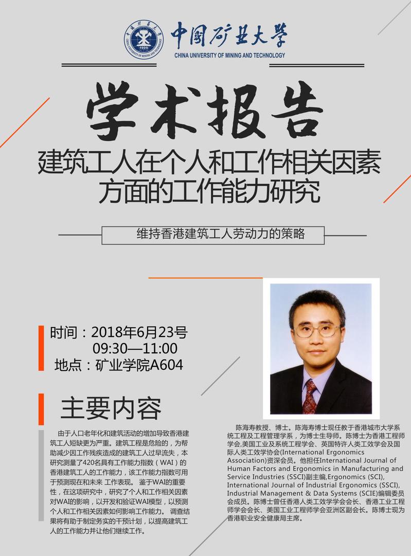 学术会议 首页 - 学科动态 - 学术会议 - 正文 学术报告:建筑工人在个人和工作相关因素方面的工作能力研究 作者:董成亮浏览:时间:2018-06-13 新闻来源:英国威廉希尔公司 摄影: 责任编辑: 审核: