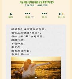 本次情书大赛活动于4月21日开始策划,面向全校各个年级的同学,在经历了前期的准备宣传以及作品投稿后,于4月28日开始作品的投票和点评环节。同时为了避免不必要的聚集,此次活动全程采取线上的方式举行。