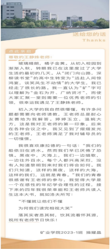 活动前期收集了员工们对老师的祝福及贺卡寄语等,活动当天通过发送短信、送出贺卡等方式向所有老师致以诚挚的感激与祝福,用真诚的祝福让老师们感受到秋日里的温暖。